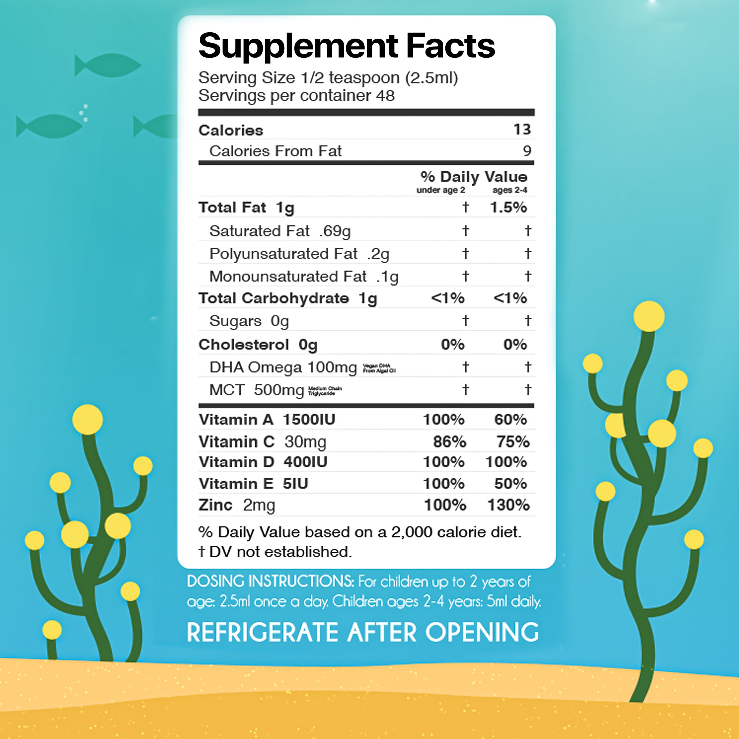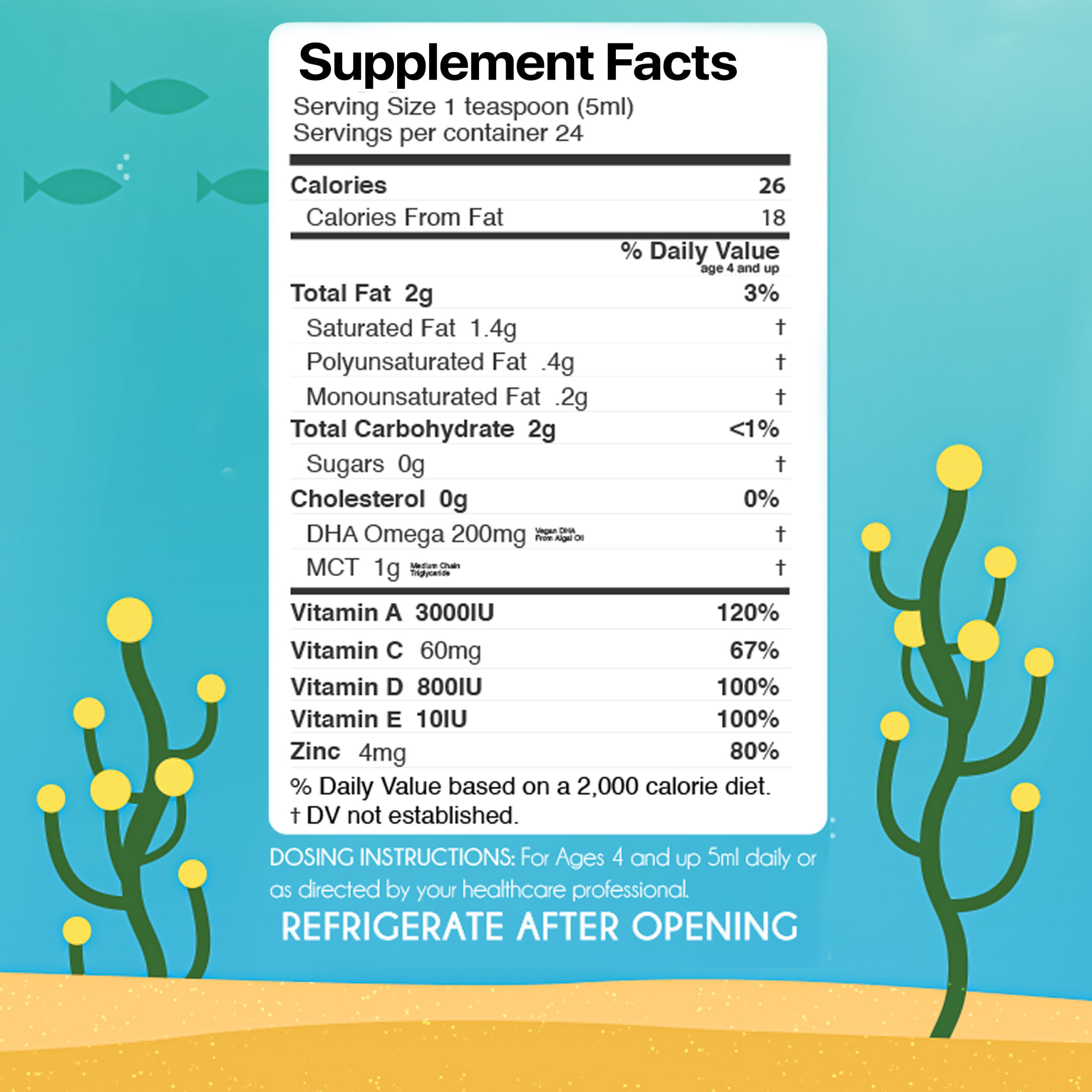 Every half a teaspoon of BabyVites is loaded with 100mg of DHA, 500mg of MCT (medium chain triglyceride) and the 3 fat soluble vitamins A, D, E. No Sugar!